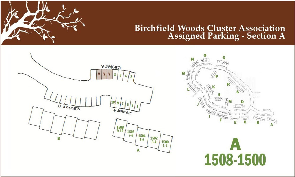 Each property has TWO ASSIGNED parking spaces. Please be aware that residents do not have property rights to these parking spaces. The parking spaces are property of the Birchfield Woods Cluster, not the homeowner they are assigned to. The Board may revoke your exclusive use for violations of the parking rules.